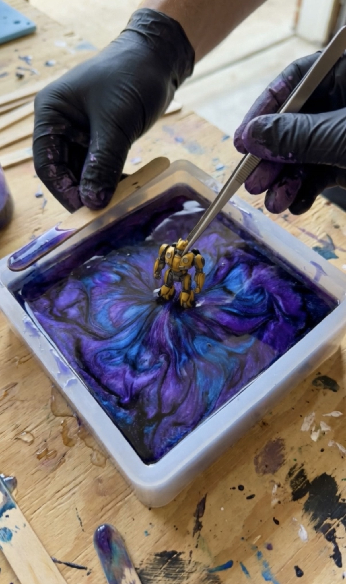 Each lamp is carefully handmade using layered resin techniques, embedding a detailed mech figure within a deep, galaxy-style design. Every pour, swirl, and placement is done by hand to create a unique 3D effect. The result is a bold, collector-quality piece built to stand out in any setup.